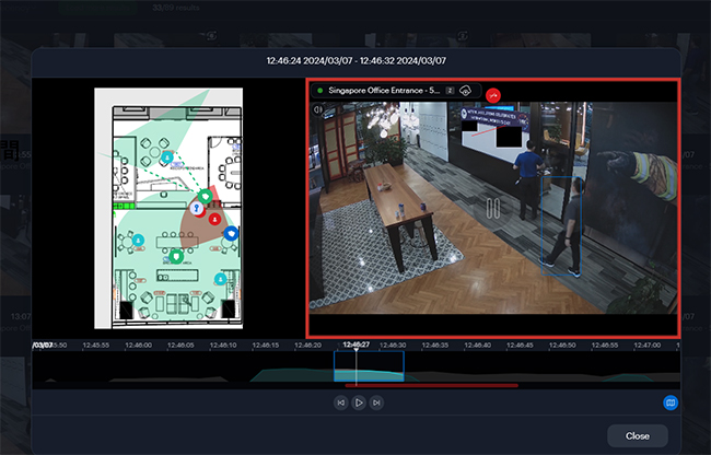 マップ上でカメラビュー内で人の侵入に合わせその人のアイコンが表示され、同時にその人を捉えたビュー画面が一緒に移動します。映像と地図表示との組み合わせにより迅速な状況認識が可能になります。